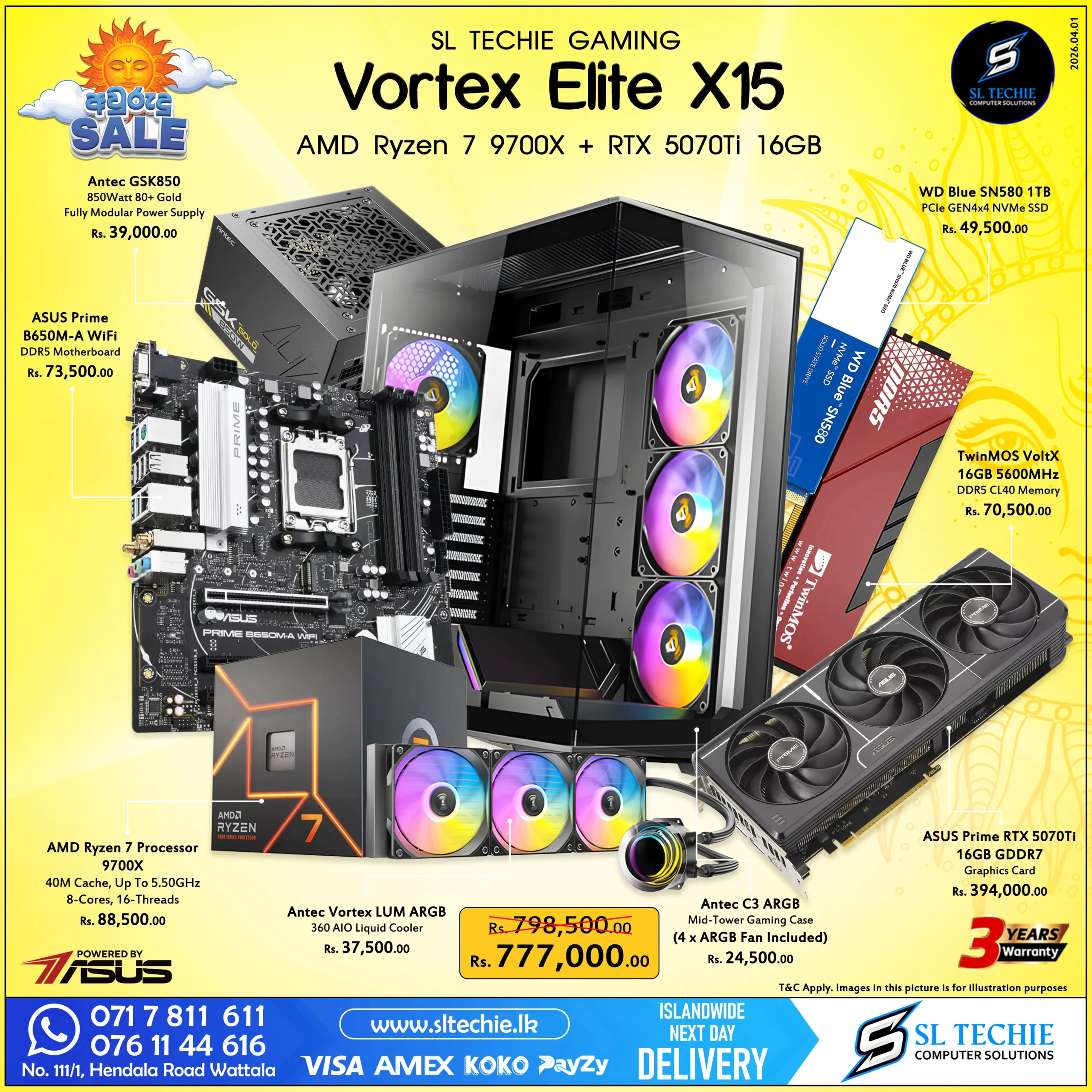 AMD Ryzen 7 9700X + RTX 5070Ti 16GB Brand New Gaming PC – Vortex Elite X15 (3Y)